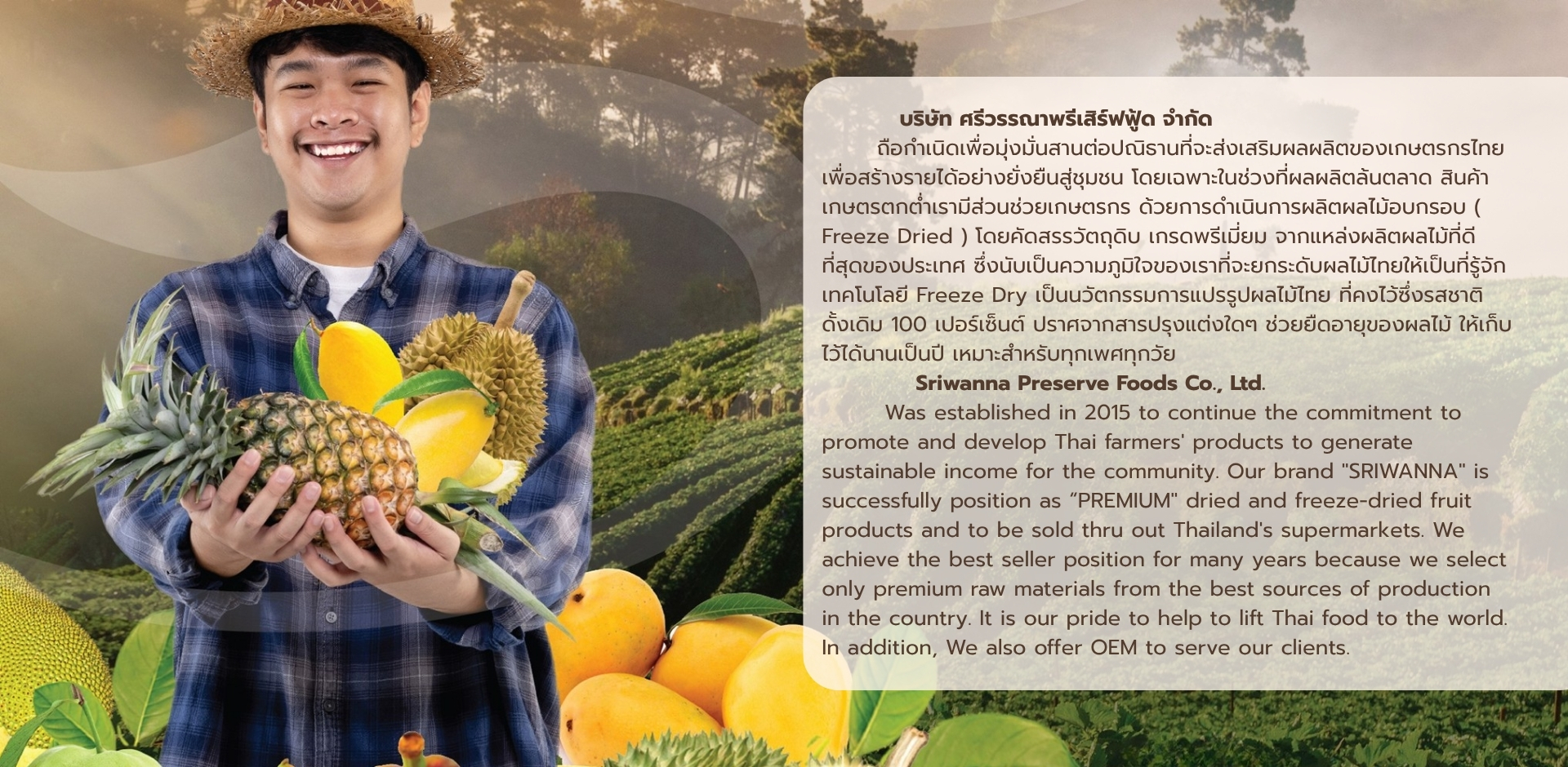 บริษัท ศรีวรรณาพรีเสิร์ฟฟู้ด จำกัด ก่อตั้งโดย คุณภาวีชญาณ์ ศรีวรรณวัฒน์ ด้วยปณิธานและความมุ่งมั่นที่จะส่งเสริมภูมิปัญญาอาหารและขนม โดยเฉพาะผลไม้ไทย ให้เป็นที่ยอมรับและแพร่หลายสู่นานาประเทศ บริษัท ศรีวรรณาพรีเสิร์ฟฟู้ด จำกัด ถือกำเนิดเพื่อมุ่งมั่นสานต่อปณิธานที่จะส่งเสริมผลผลิตของเกษตรกรไทยเพื่อสร้างรายได้อย่างยั่งยืนสู่ชุมชน โดยเฉพาะในช่วงที่ผลผลิตล้นตลาด สินค้าเกษตรตกต่ำ เรามีส่วนช่วยเกษตรกร ด้วยการดำเนินการผลิตผลไม้อบแห้ง โดยเฉพาะมะม่วงอบแห้ง น้ำตาลน้อยและผลไม้อบกรอบ (Freeze Dried)โดยคัดสรรวัตถุดิบ เกรดพรีเมี่ยม จากแหล่งผลิตผลไม้ที่ดีที่สุดของประเทศ ซึ่งนับเป็นความภูมิใจของเราที่จะยกระดับผลไม้ไทยให้เป็นที่รู้จัก เทคโนโลยี Freeze Dry เป็นนวัตกรรมการแปรรูปผลไม้ไทย ที่คงไว้ซึ่งรสชาติดั้งเดิม 100 เปอร์เซ็นต์ ปราศจากสารปรุงแต่งใดๆ ช่วยยืดอายุของผลไม้ให้เก็บไว้ได้นานนับปี เหมาะสำหรับทุกเพศทุกวัย